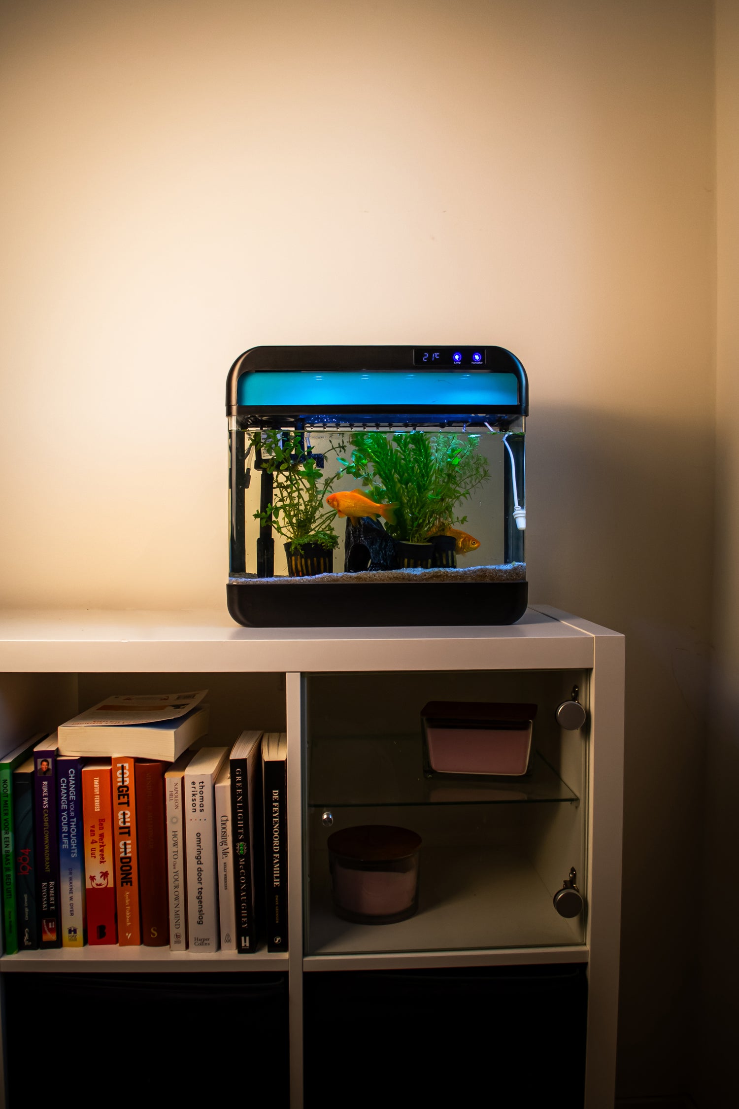 Plotselinge veranderingen in temperatuur of zuurgraad stressen vissen enorm. Ons aquarium helpt dit voorkomen met de ingebouwde pomp en temperatuurmeting, maar check zelf ook regelmatig even het water.
